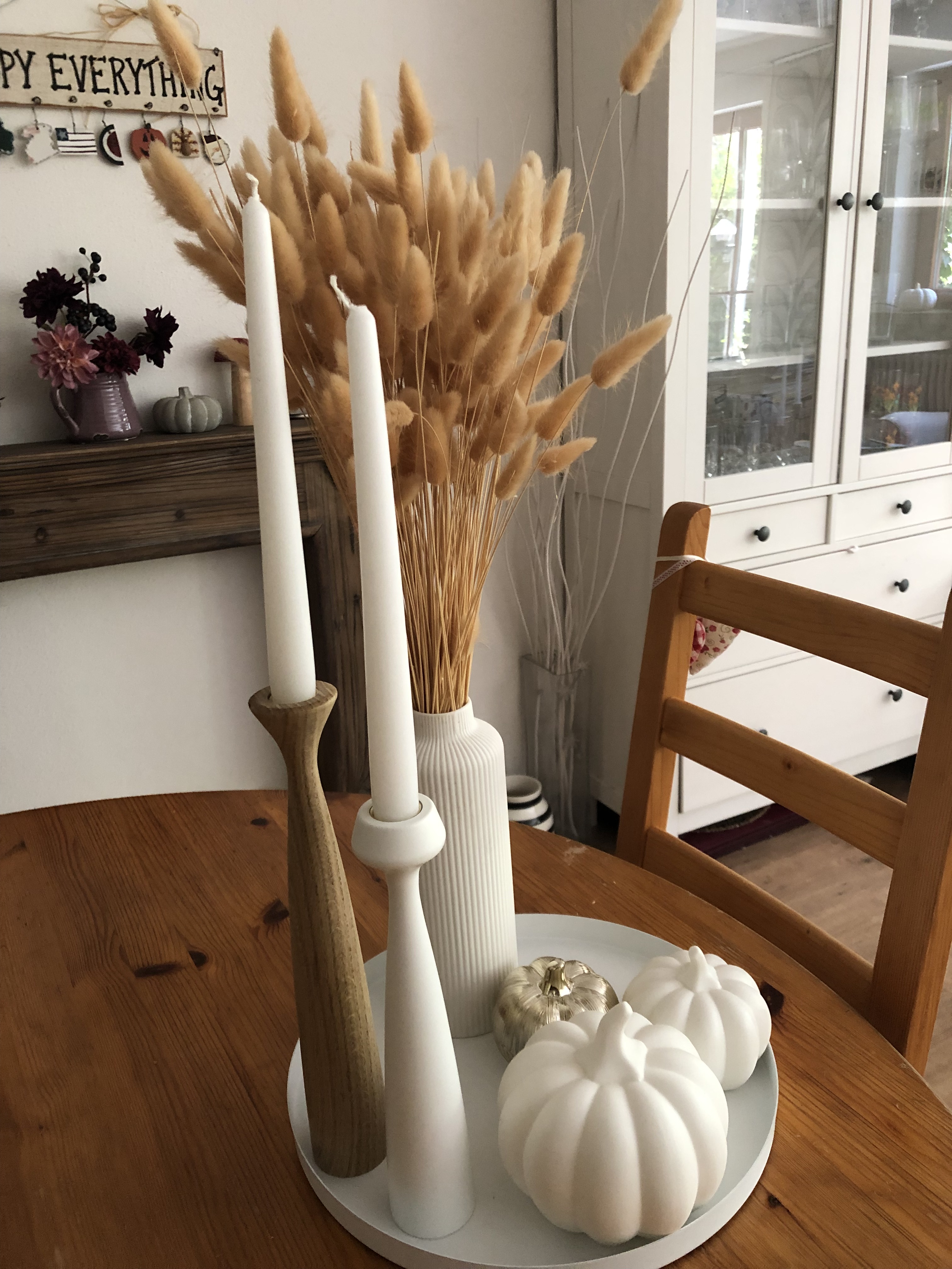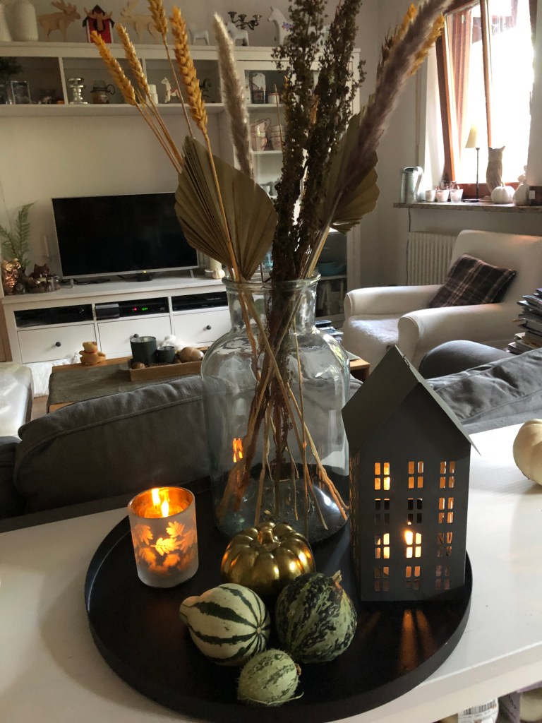 Jetzt ist der Sommer schon wieder vergangen und der Herbst klopft deutlich vernehmbar an. Meine Deko habe ich bereits Anfang September gewechselt, auch wenn wir danach noch ein paar angenehm milde Tage hatten. Aber Abends wird es immer früher dunkel und da freue ich mich über Kerzenschein und warme Farben.
