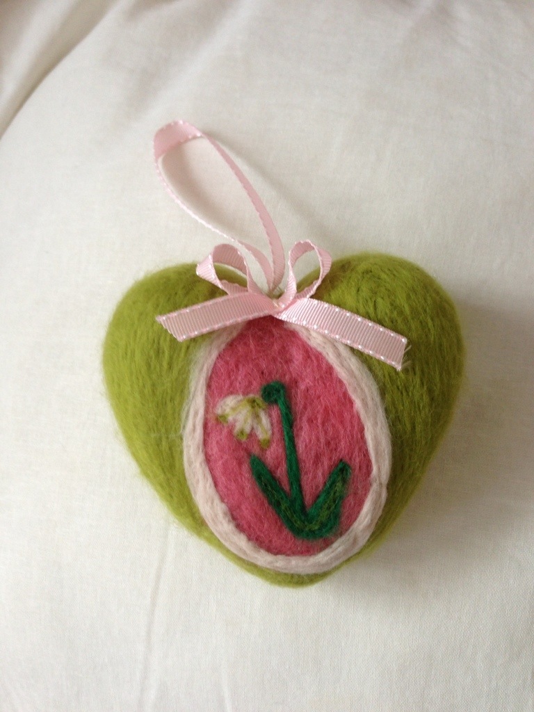 Herzen sind jeweils auf einem Styroporkörper gefilzt, der Rest frei.
