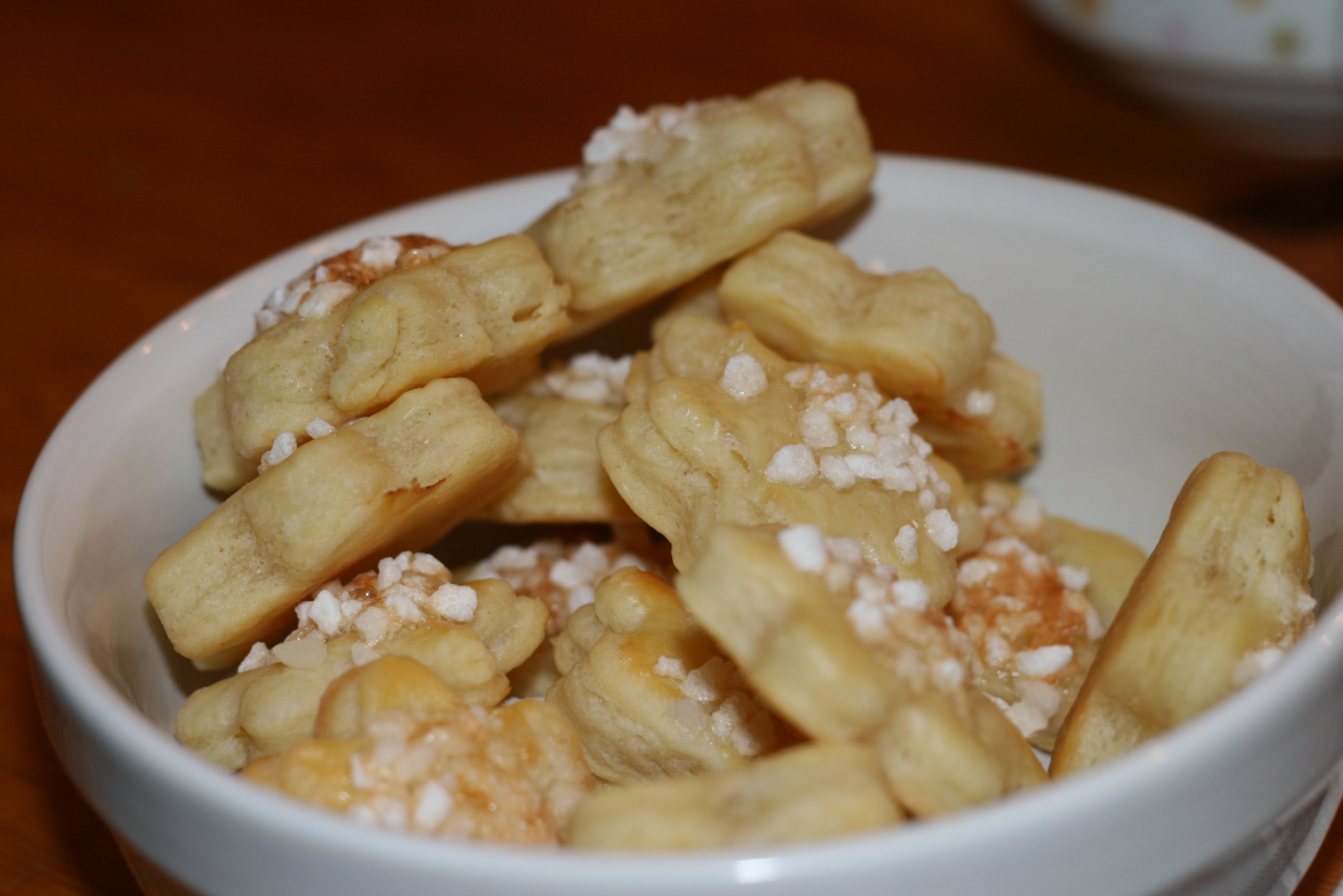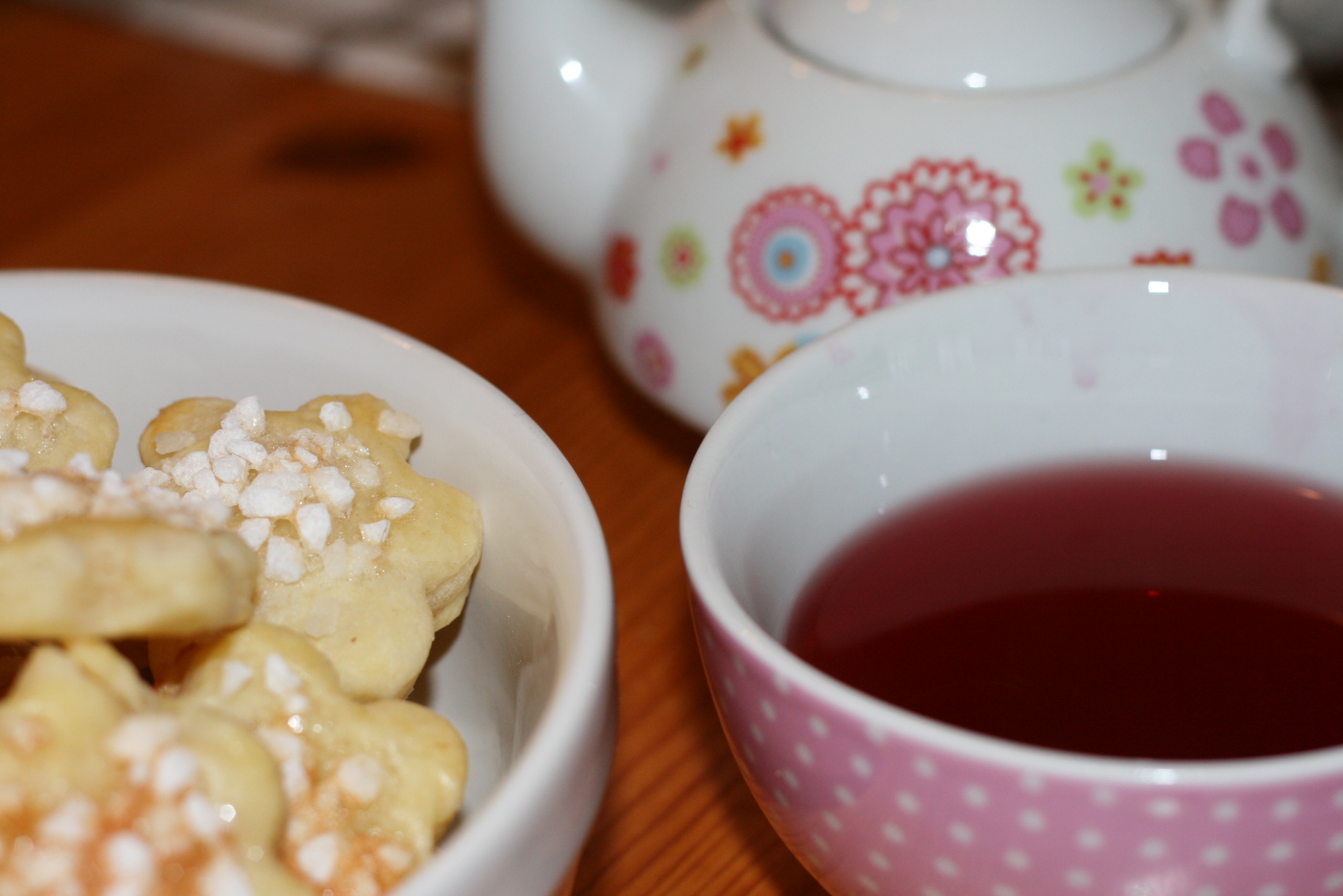 Heute ist es wirklich naß und ungemütlich draussen und es will nicht hell werden. Um da nicht mürrisch zu werden hilft am Besten eine Teestunde mit frisch gebackenen Keksen. Ja, Keksen, nach Weihnachten sind es bei uns Kekse – und damit auch niemand auf die Idee kommt, Plätzchen zu sagen haben Emily und ich Blumenkekse aus dem Saure-Sahne-Teig ausgestochen. Das Rezept findet ihr hier