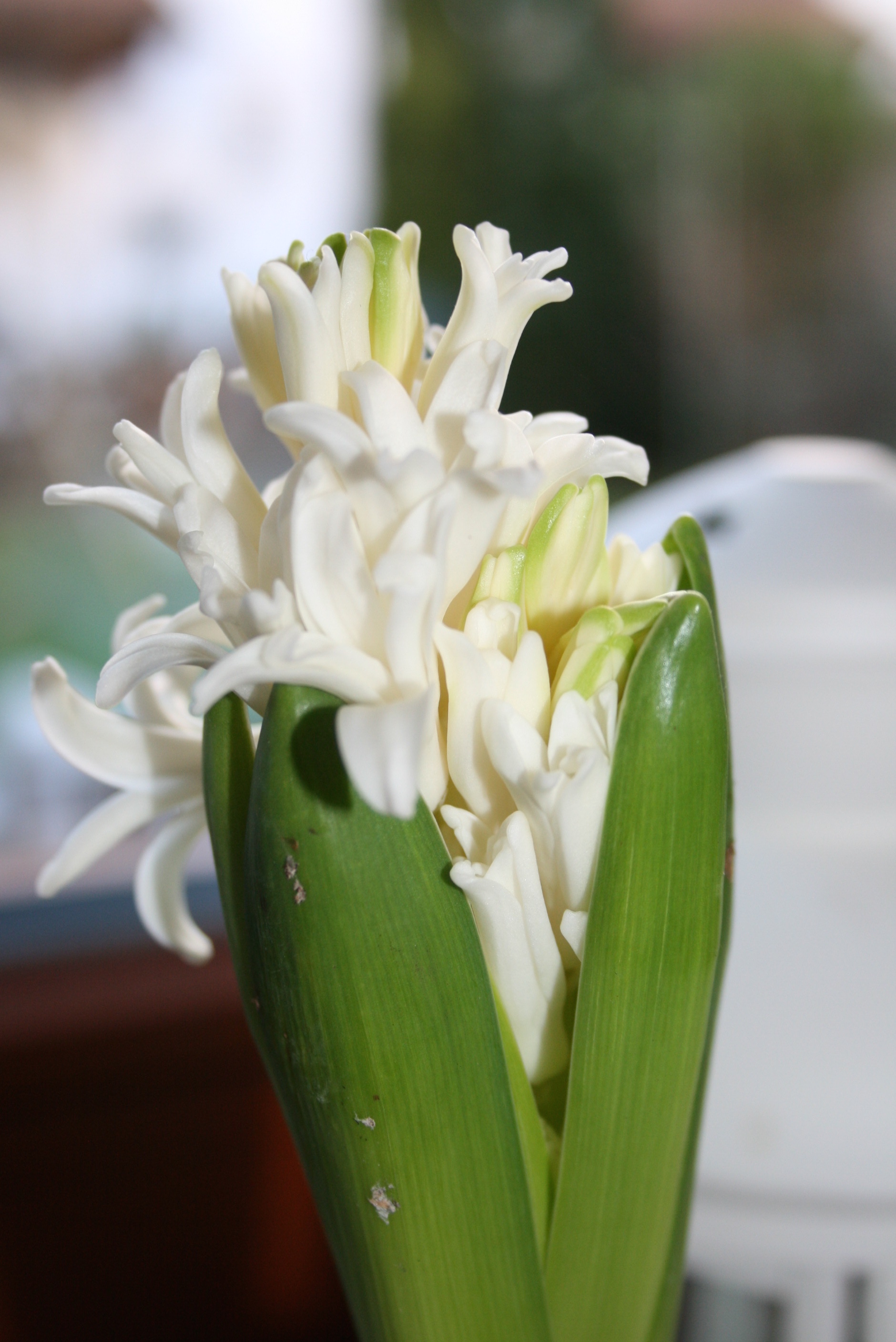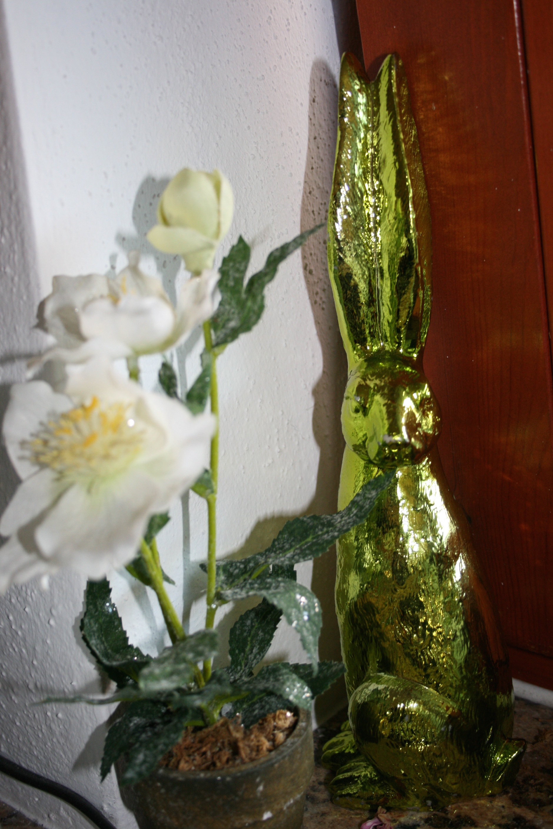 Dabei ist es draussen gerade heute sehr frühlingshaft, also genau gegenteilig. Der ganze Schnee, den wir nach Weihnachten doch noch bekommen hatten, ist samt dem kleinen Schneemann im Vorgarten ratzeputz verschwunden. Ein bisschen Frühling habe ich mir mit rosa Tulpen und weißen Hyazinthen ins Haus geholt. Ausserdem darf – Familientradition ! – der „grüne Hase“ als früher Botschafter des Frühlings natürlich nicht fehlen !